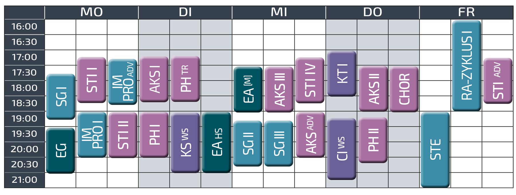 Die Kurse sind als berufsbegleitende Weiterbildung konzipiert und finden vorwiegend abends statt. Sie gehen in der Regel über 10 Wochen (1,5 Stunden pro Woche): Wintertrimester (Jänner bis März), Frühlingstrimester (April bis Juni) und Herbsttrimester (Oktober bis Dezember); zusätzlich bieten wir eine Sommerakademie an (hauptsächlich im August).