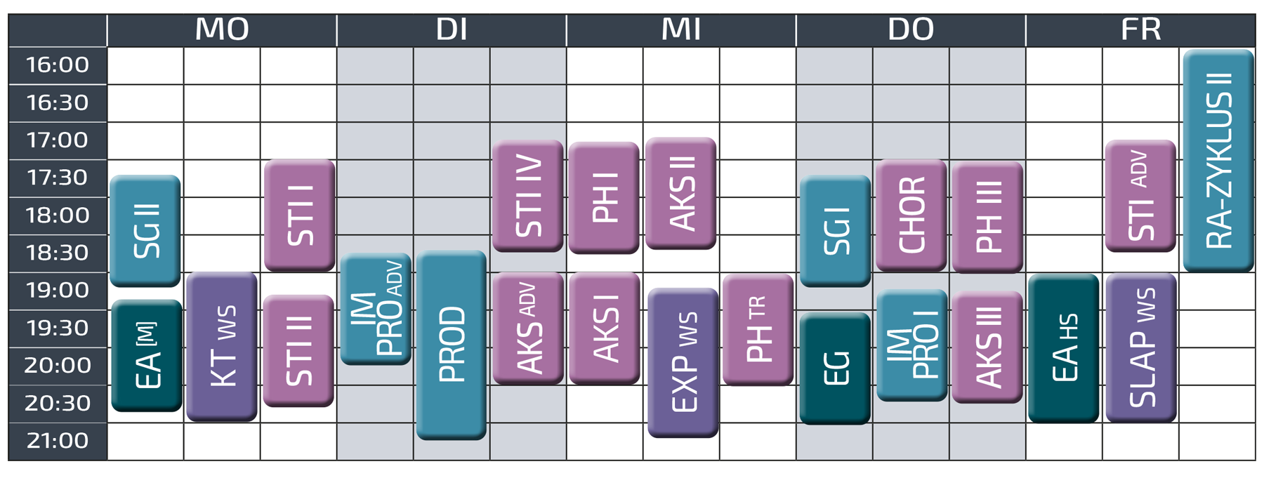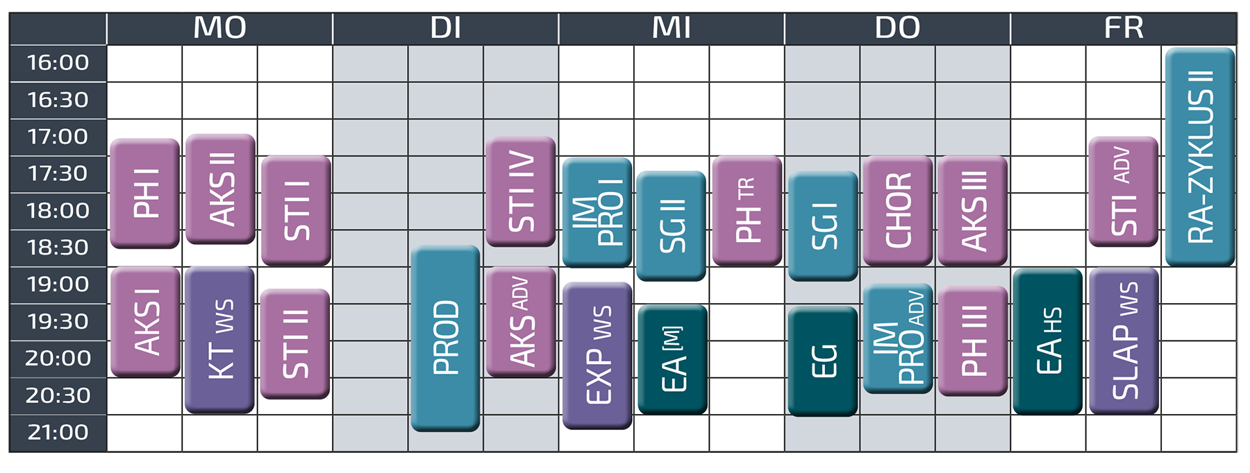 Die Kurse sind als berufsbegleitende Weiterbildung konzipiert und finden vorwiegend abends statt. Sie gehen in der Regel über 10 Wochen (1,5 Stunden pro Woche): Wintertrimester (Jänner bis März), Frühlingstrimester (April bis Juni) und Herbsttrimester (Oktober bis Dezember); zusätzlich bieten wir eine Sommerakademie an (hauptsächlich im August).